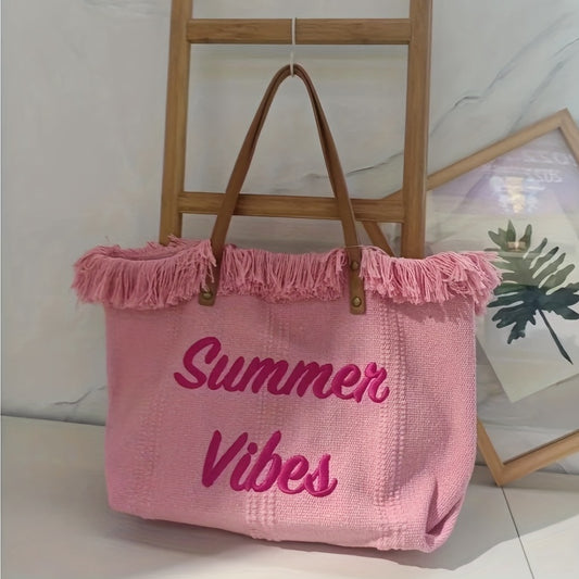 Bohemian Chic Embroidered Tote Bag - Stylish Letter Detail, Fringe Trim, Durable Canvas, Adjustable Shoulder Strap, Perfect for Womens Summer Beach Wear