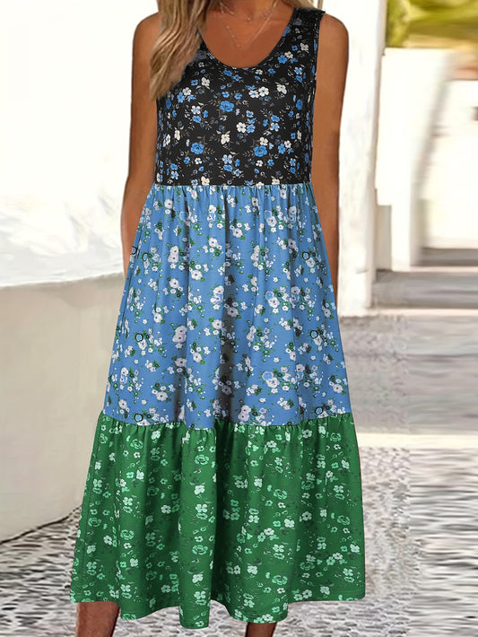 Vibrant Color Block Floral Print Tiered Tank Dress - Relaxed Fit, Crew Neck, Casual, Comfortable, Soft Fabric - Womens Summer Clothing, Beach Dress, Vacation Wear