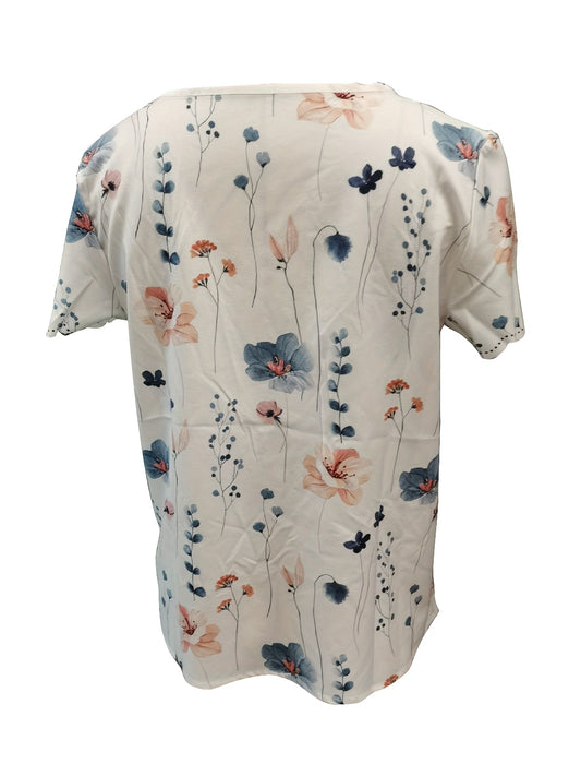 Vibrant Floral Print Scallop Trim T-Shirt - Relaxed Casual Fit, Flattering V Neck, Short Sleeves for Warm Weather Comfort - Perfect for Spring and Summer Seasons, Womens Everyday Wear
