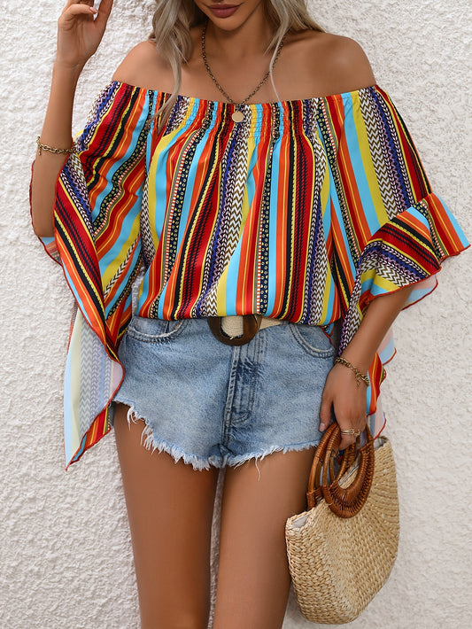 Vibrant Stripe Off-Shoulder Blouse - Flirty Ruffle Trim, Lightweight & Breathable - Womens Summer Vacation Wardrobe Staple